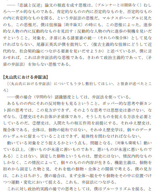 ヘーゲルの円環運動とカントの楕円運動との違いと、それがもたらした日本の社会科学への影響について考えている。丸山真男とヘーゲルでは、以下の笹倉秀夫先生が丸山真男に行ったインタビュー記録は非常に役立つ。丸山は学的認識ではヘーゲル的弁証法を利用するが、政治実践では弁証法の危険性ゆえに否定した。